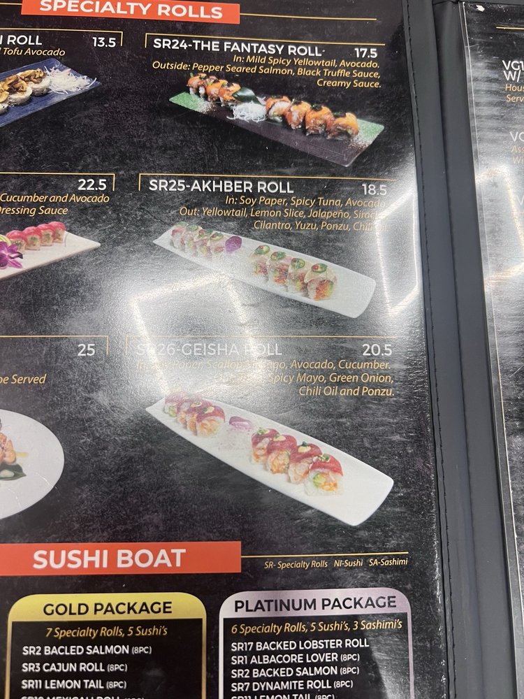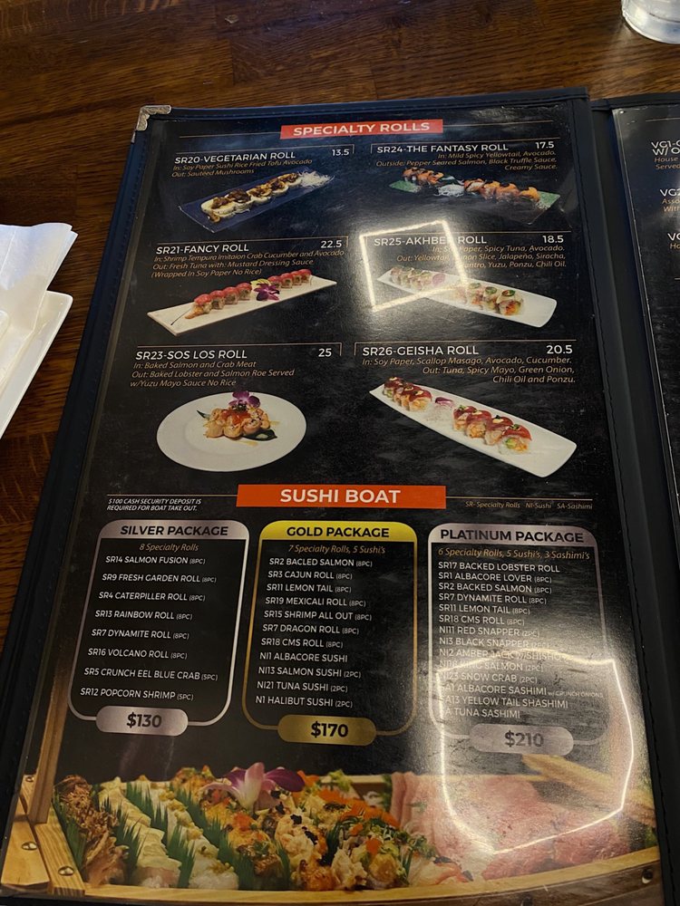 In: BAKED CALIFORNIA ROLL Out: BAKED SALMON TOPPED WITH BAKED SPICY TUNA SERVED WITH EEL SAUCE
